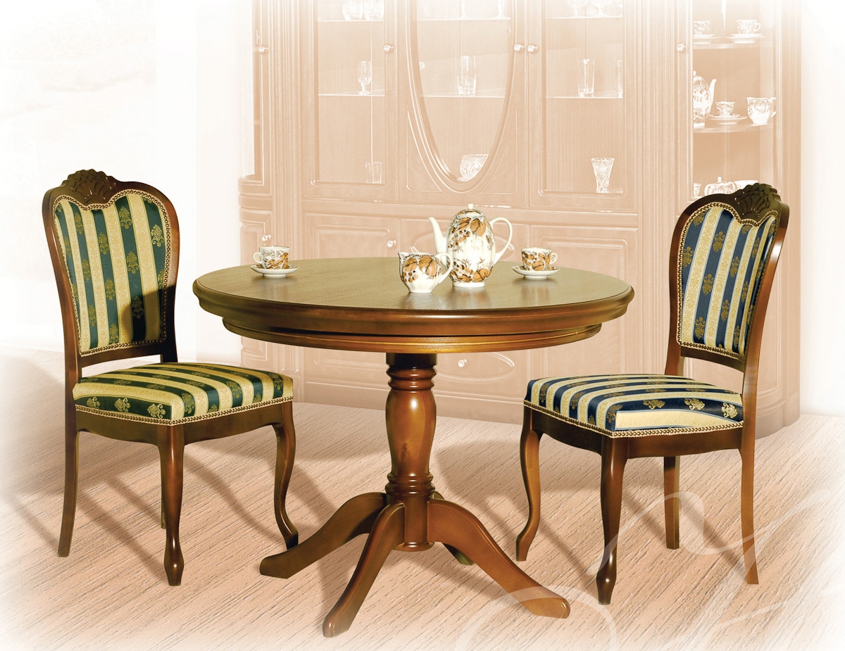 Круглая крышка стола выполнена из МДФ и облицована строганым шпоном ясень. Нога-опора - из массива березы. Отделка - полиуретановый лак, цвет - грецкий орех.